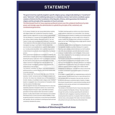 Politicians and certain media outlets must stop exploiting Shincheonji Church of Jesus for political contention. The Joint Investigation Headquarters must conduct an impartial investigation. Shincheonji Church of Jesus expresses deep concern regarding the proliferation of speculative reports based solely on the unilateral claims of expelled individuals. These reports involve allegations of “mass entry into the […]